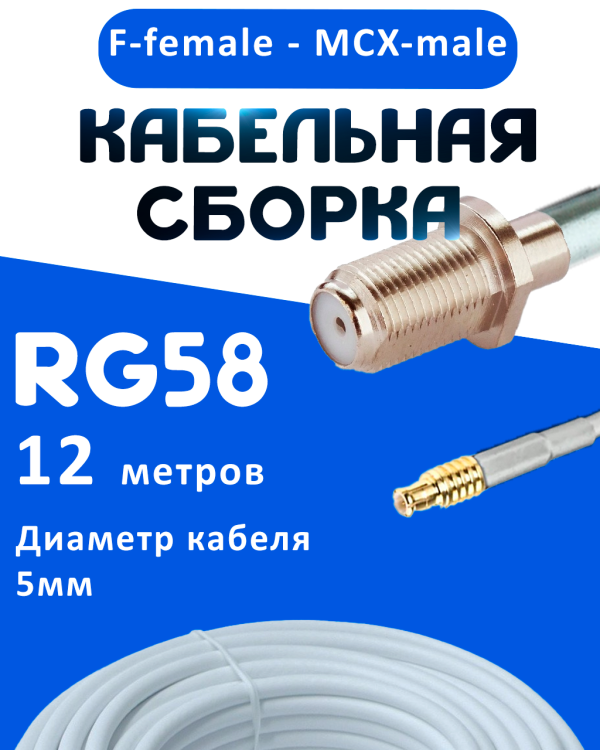 Описание и характеристики для товара Кабельная сборка 50 Ом на RG-58 белого цвета с разъемами F-female - MCX-male, 12 метров