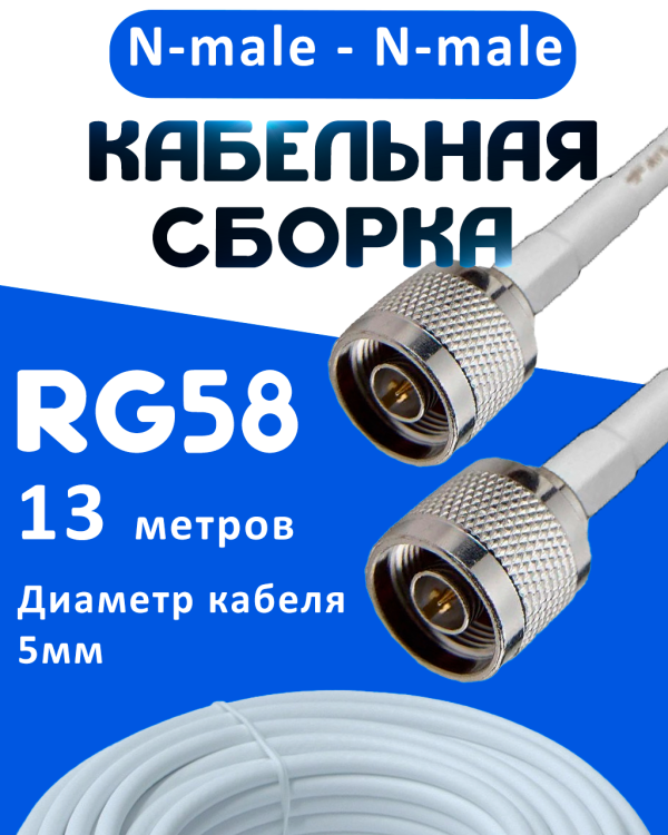 Описание и характеристики для товара Кабельная сборка 50 Ом на RG-58 белого цвета с разъемами N-male - N-male, 13 метров