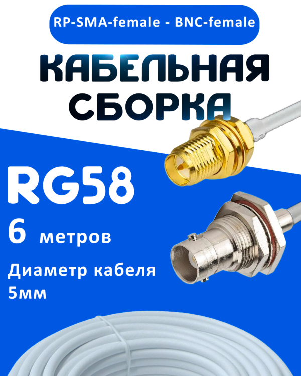 Кабельная сборка 50 Ом на RG-58 белого цвета с разъемами RP-SMA-female - BNC-female, 6 метров