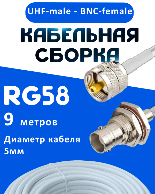 Описание и характеристики для товара Кабельная сборка 50 Ом на RG-58 белого цвета с разъемами UHF-male - BNC-female, 9 метров