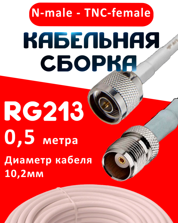 Описание и характеристики для товара Кабельная сборка RG-213 белого цвета с разъемами N-male - TNC-female, 0,5 метра